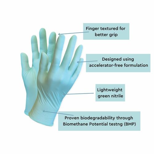 BioGlove Nitrile Disposable Gloves are enhanced with the latest technology to allow them to biodegrade in anaerobic conditions in landfills. BioGlove is certified through Biomethane Potential Testing (BPM) according to ASTM D5511. BioGlove is certified to biodegrade in accelerated conditions by 21% within 66 days, up to 10 times faster than regular nitrile disposable gloves. BioGlove offers an ‘end life solution’ for reduction of waste. Consumers simply need to place used BioGlove disposable gloves in the rubbish bin. BioGlove Disposable Gloves are a lightweight green nitrile glove that is suitable for a broad range of applications. Lightweight comfortable nitrile is highly dexterous allowing the user excellent grip and feel. BioGlove Nitrile Disposable Gloves are powder free, single use only. Certified Biodegradability to ASTM D5511. |