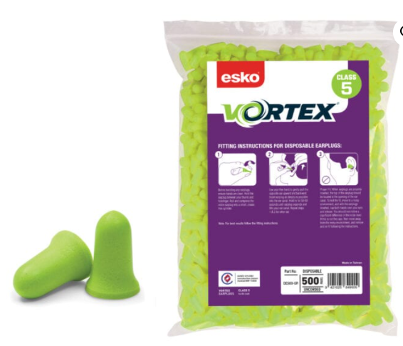 Esko Vortex earplugs, hi-vis green, bell-shaped, bag 500 uncorded pairs, dispenser refill