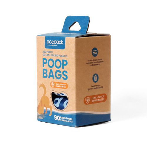 These Ecopack poop bags are made with recycled ocean-bound plastic that has been recovered from coastlines and waterways.