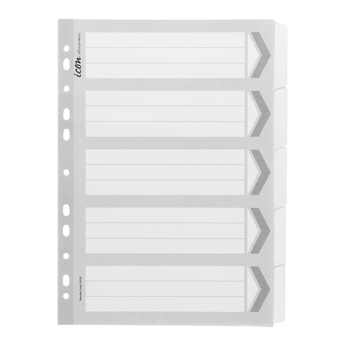 Icon Cardboard Dividers are great for organising work and projects. Dividers with reinforced plastic tabs, designed for heavy duty use. Multi punched reinforced spine for use with all ring binders. Comes with a seperate contents page for easy referencing. 5 blank tabs. A4 size. Black and White colour.