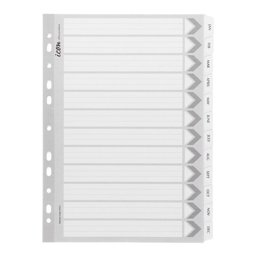 Icon Cardboard Dividers are great for organising work and projects. Dividers with reinforced plastic tabs, designed for heavy duty use. Multi punched reinforced spine for use with all ring binders. Comes with a seperate contents page for easy referencing. Jan-Dec calendar tabs. A4 size. Black and White colour.
