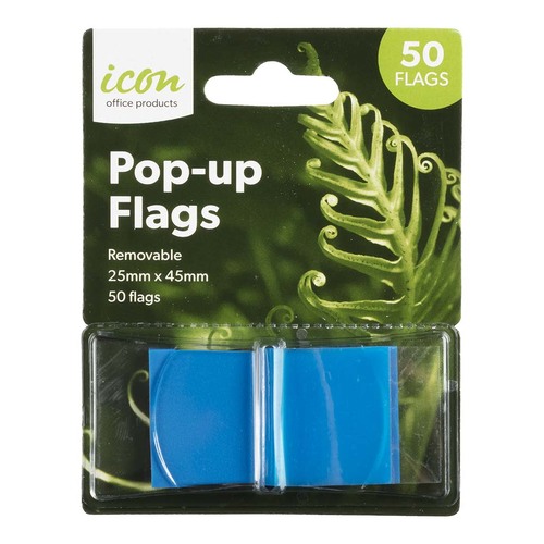 Icon Flags are ideal for marking or highlighting pages with important information. These self-adhesive flags can be repositioned, reused and can also be written on! The pop-up dispenser keeps flags always within reach. 25x45mm size. Pack of 50 blue flags.