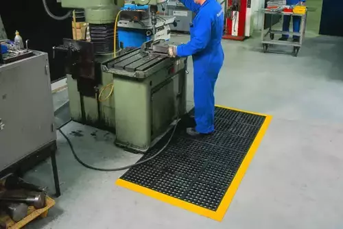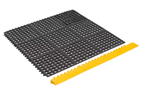 Interlink mats are made of a heavy duty natural rubber that offers excellent anti-fatigue characteristics in industrial and commercial work areas. If you need an irregular shape or larger size, let us make it for you. Interlink mats have a hidden interlocking system designed to connect all four sides making it perfect for covering large floor areas. For easy trolley access and extra employee safety, attach the 75mm wide safety bevelled edge ramp.