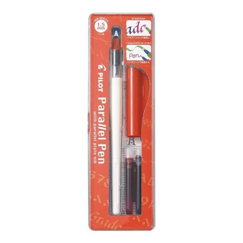 The Pilot Parallel Pen features two parallel plates on the nib point for beautiful, sharper lines. It can produce attractive, graduated colours by transferring ink from one pen nib to another. Packaged with 2x ink cartridges (black and red), ink converter and nib cleaner. 1.5mm nib. Purchase 12 to receive a box.